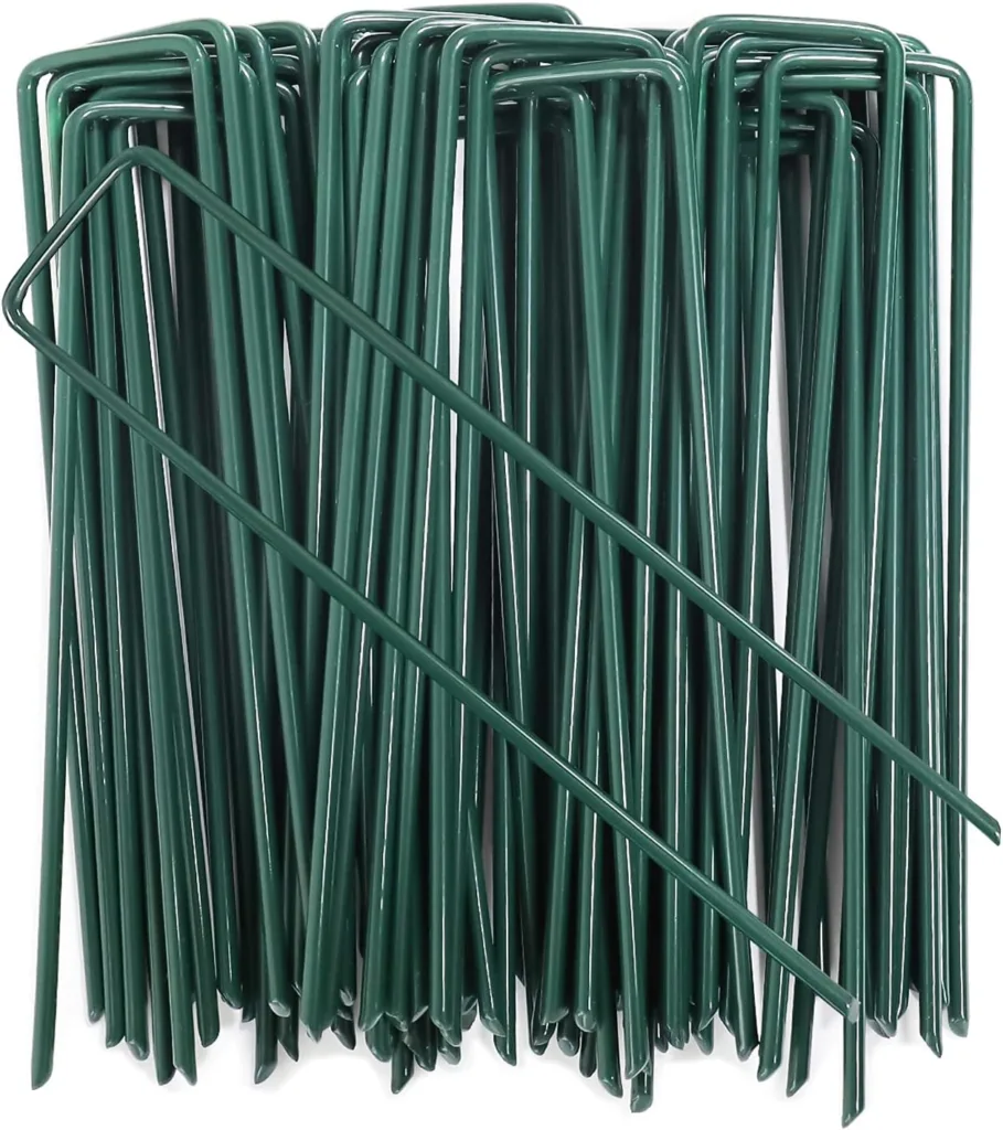 - Doble los bordes de la malla hacia abajo y sujételos al suelo utilizando grapas de sujeción. Esto es particularmente útil para áreas donde se prevé el deshilachado de los bordes cortados.